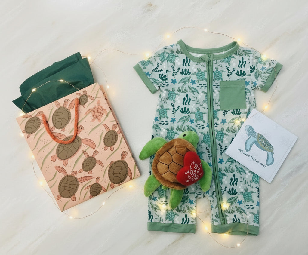 Make your gift giving stand out with this fun Coral colored Sea Turtle themed gift bag complete with dark green tissue paper, for all of your gift giving needs.Ā