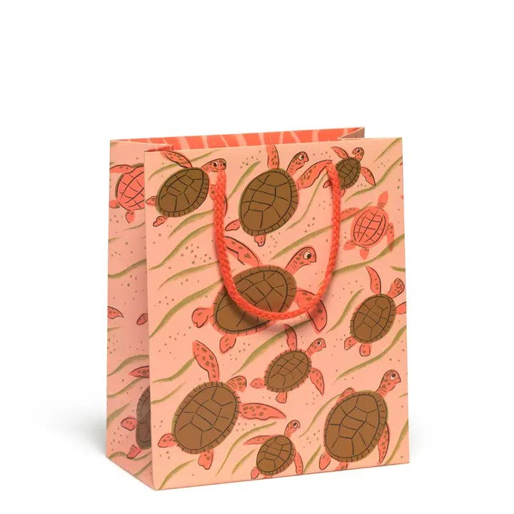 Make your gift giving stand out with this fun Coral colored Sea Turtle themed gift bag complete with dark green tissue paper, for all of your gift giving needs.Ā