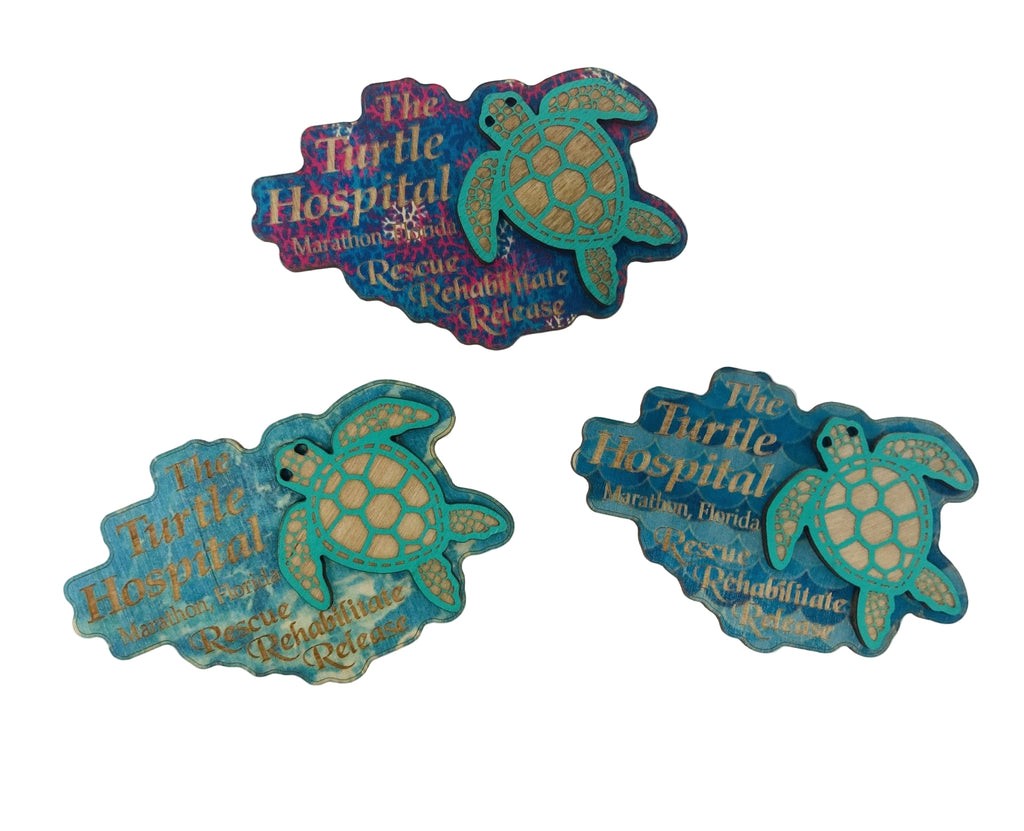 Bring a bit of coastal charm to your fridge, school locker, or any metal surface with our laser-cut wood magnet featuring a beautifully detailed sea turtle. Customized with "The Turtle Hospital Marathon FL. Rescue Rehab Release," this magnet is proudly made in the USA and is a meaningful way to show your support for a great cause. Perfect for holding up reminders, photos, or simply adding a touch of the Florida Keys to your space, this magnet does more than just stick—it helps save lives. All proceeds go directly to the Turtle Hospital, a non-profit dedicated to rescuing, rehabilitating, and releasing sick and injured sea turtles.
