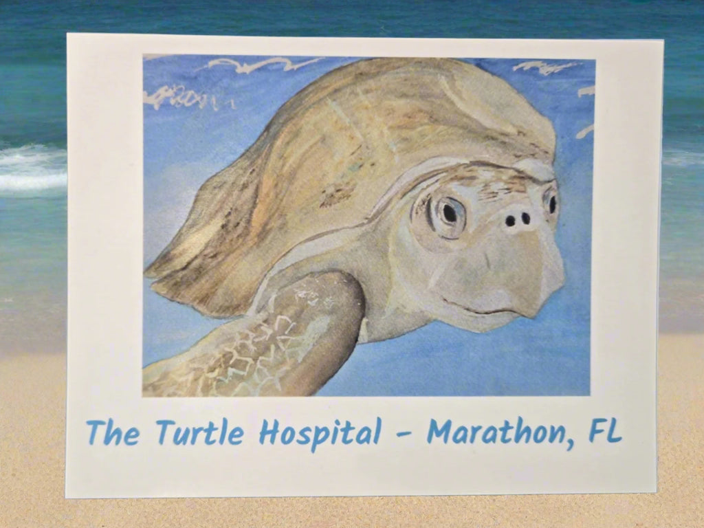 This beautiful postcard showcases Bender, one of The Turtle Hospital’s permanent residents, a big, lovable Kemps Ridley sea turtle with tons of personality. 🐢💻✏️💧