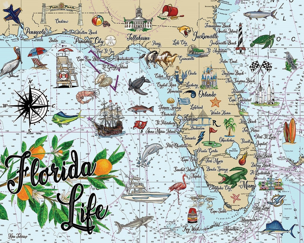 Spot your favorite destinations while exploring hand illustrated treasures like manatees drifting through warm waters, flamingos striking their classic pose, blue crabs, sea turtles, dolphins, historic ships, citrus groves, and beloved coastal towns. It is educational, nostalgic, and full of personality, making it just as fun to build as it is to admire once completed.