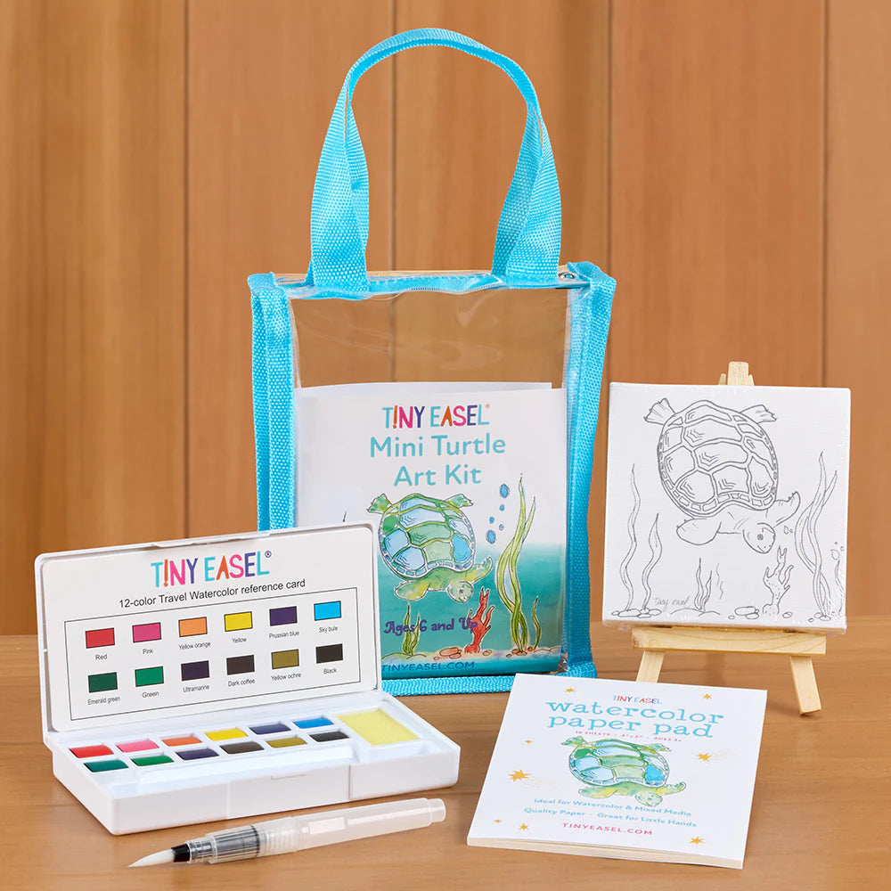 Inspire creativity! This fun Mini Art Kit features a sea turtle-printed canvas with a vibrant watercolor paint set. It's excellent entertainment for rainy days and birthday parties.